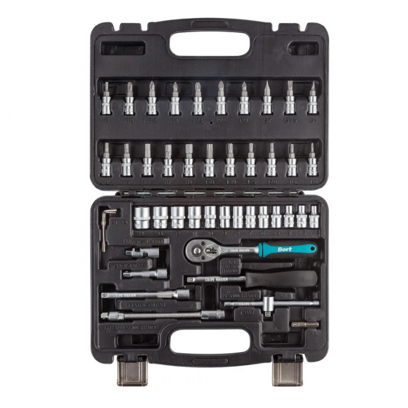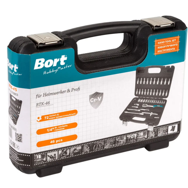Набор ручного инструмента BTK-46 благодаря своему наполнению решает множество задач. Используйте его для ремонтных, монтажных и демонтажных работ дома, на даче, в автомобиле. Комплект станет отличным подарком для любителей и профессионалов. Инструменты помещены в стильный легкий кейс для удобного хранения и транспортировки. Улучшенные петли и замки обеспечивают удобное применение в течение всего срока службы. Изделия выполнены из высококачественного металла для особой прочности. В комплект входят: головки 13 размеров, торцевые головки с аналогичным посадочным квадратом и со вставками-битами для различных видов крепежных материалов, отвертка для бит, трещоточный ключ на 72 зуба с возможностью быстрого сброса, шестигранный адаптер, удлинители в двух размерах, гибкий удлинитель для работы в труднодоступных местах, Т-образный вороток, шестигранный ключ в 4-х размерах и карданный шарнир. Посадочный размер инструментов из набора — ¼ дюйма, самый распространенный формат. На комплект распространяется стандартная гарантия — 2 года и расширенная — 5 лет.