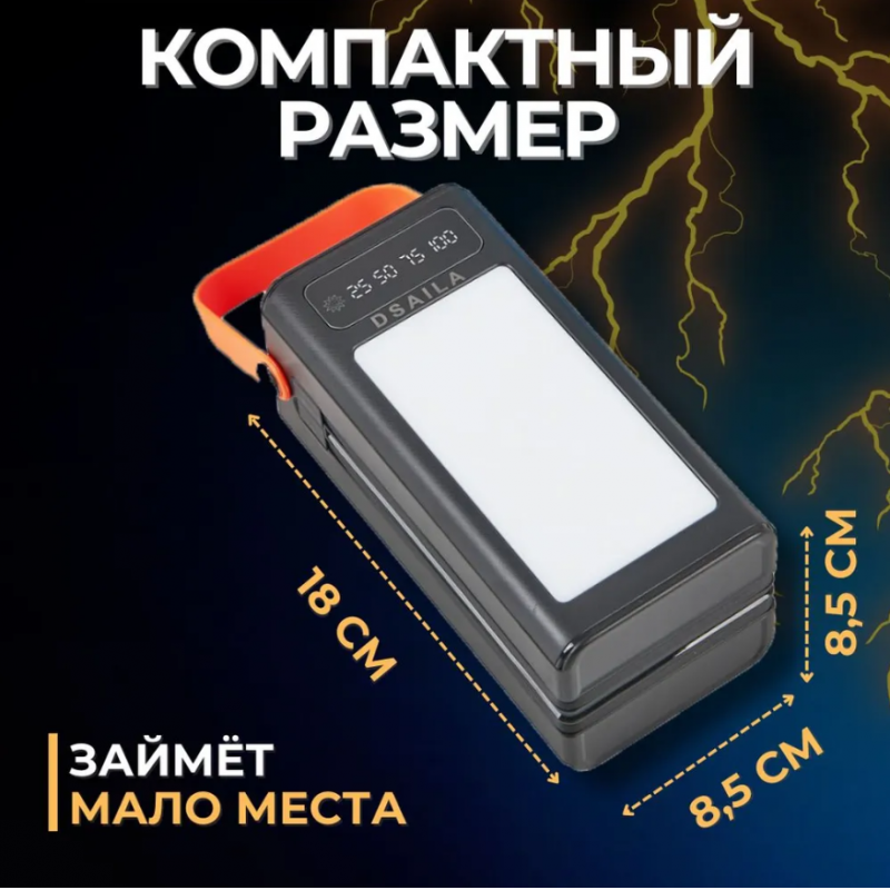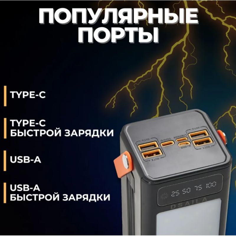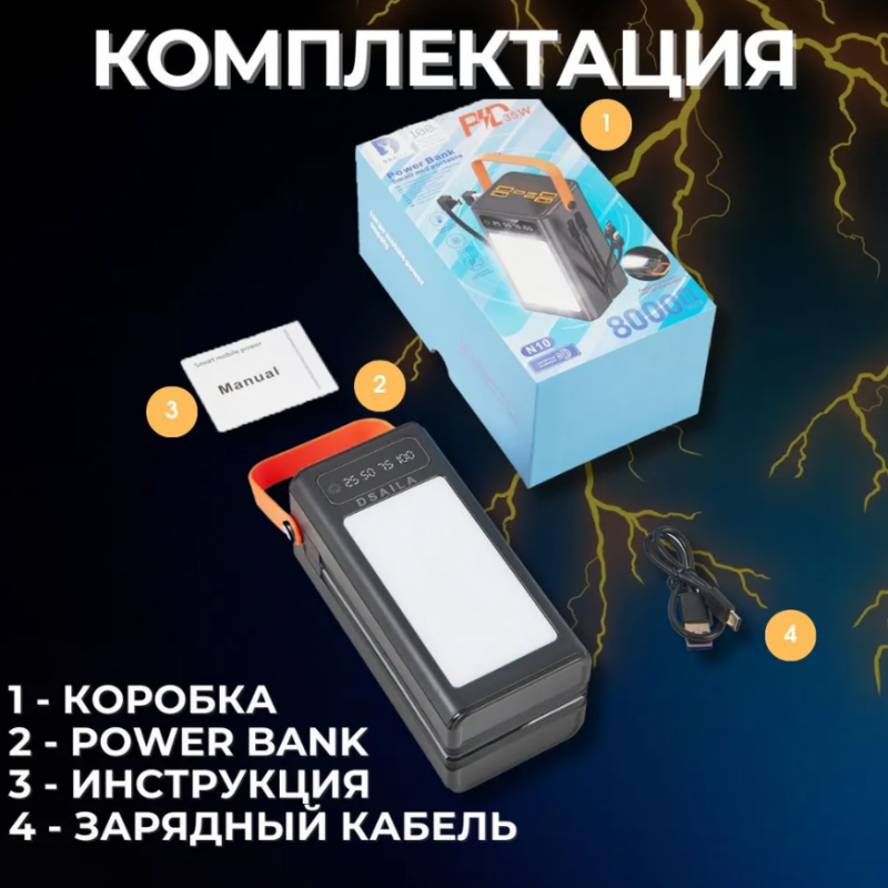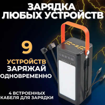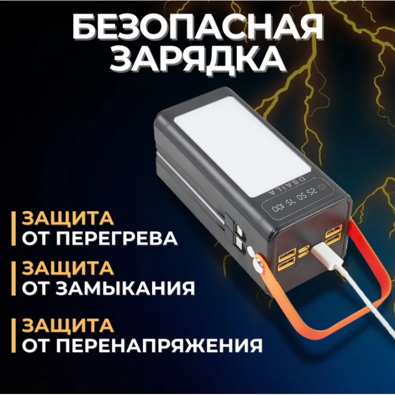 Внешний портативный аккумулятор для телефона 80000 mAh - это ваш верный спутник в любой поездке! Благодаря возможности заряжать 4 устройства одновременно и поддержке всех популярных стандартов быстрой зарядки вы всегда сможете оставаться на связи! Функция Smart ID позволит не переживать за безопасность ваших гаджетов во время их подзарядки. Дисплей с индикатором уровня заряда, ремешок для крепления и переноски, встроенный фонарь - добавят комфорта в использовании данного Power Bank'a. Поддержка стандартов быстрой зарядки Power Delivery / Quick Charge 3.0 / AFC / SCP / FCP и др. Четыре выходных разъема USB-A и один Type-C + три разъема для зарядки самого Power Bank'а Micro-USB, Type-C и Lightning. Smart ID - Встроенная микросхема системы распределения токов определяет, и сама назначает наиболее безопасный и эффективный ток для питания различных типов портативной электроники. Встроенный фонарь (96 часов работы). Дисплей с индикатором уровня заряда.